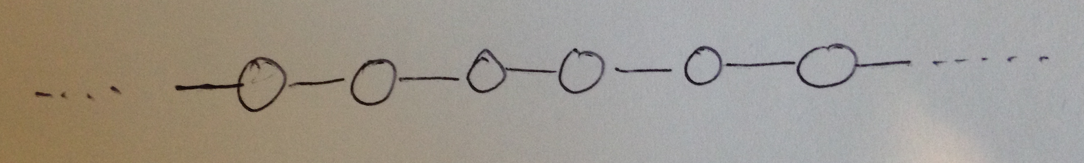 In a step towards trying to answer this question, I wanted to demonstrate that every graph with only even order vertices contains a circuit. I had them first try to construct graphs where each vertex has even order but the graph contains no circuit. Some elaborate failed attempts ensued, but then one child made the following remarkable claim: “it’s possible if the number of vertices is infinite”. I queried this child, and he drew the following “graph”: